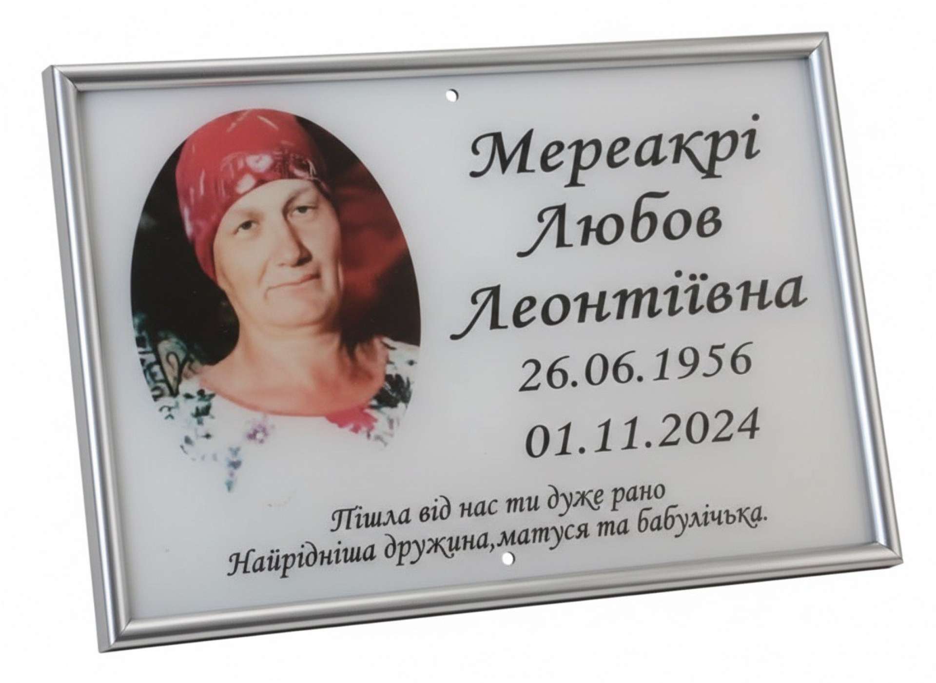 Фотография на стекле (акрил) с текстом и защитным материалом на задней части для максимально долгой эксплуатации красок фотографии. Табличка крепится на крест или памятник.