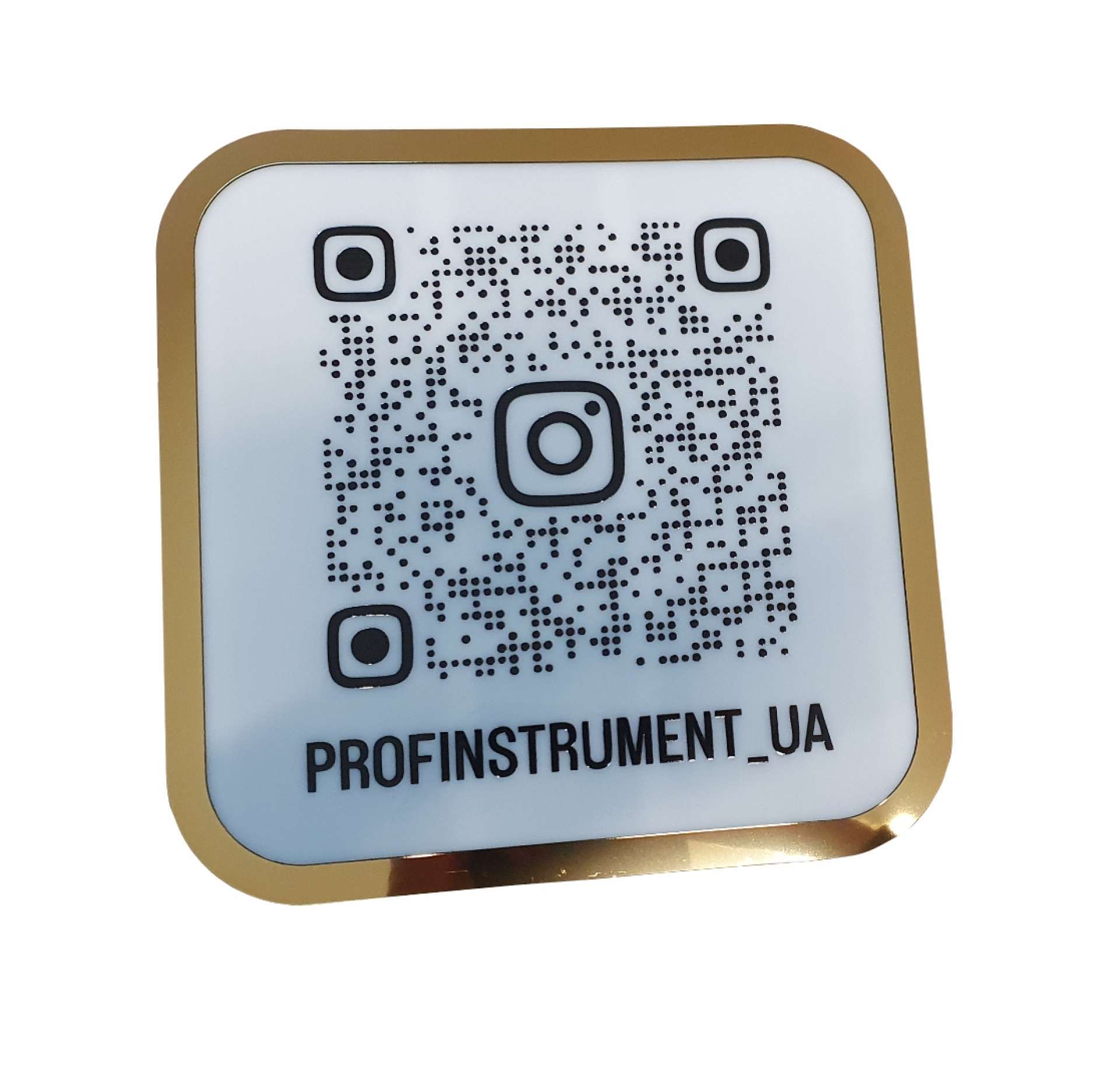 Инстаграм-визитка из акрила с покрытым Qr-кодом текстом в Одессе. По краю идет выпуклая золотистая рамка.