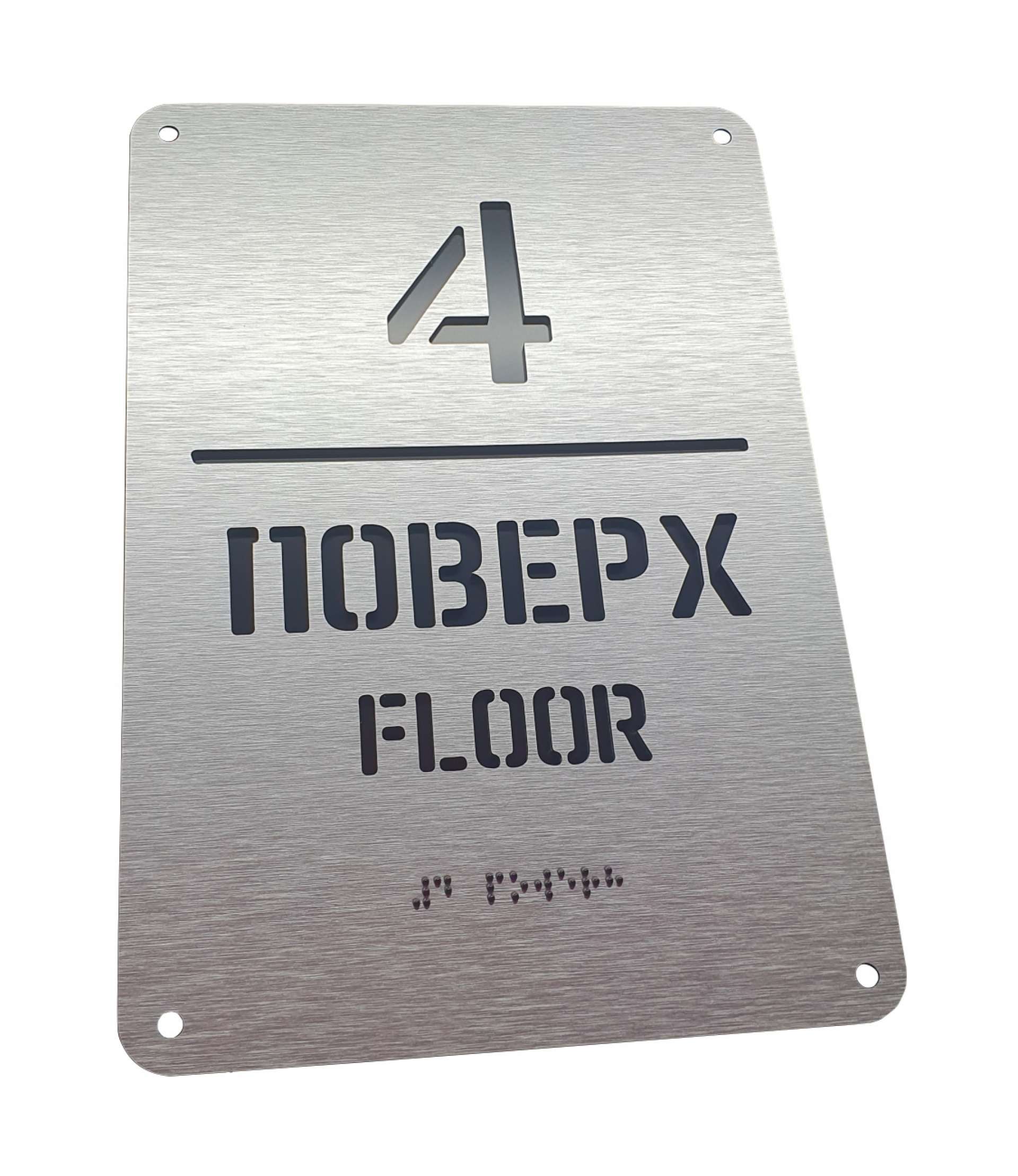 Табличка этаж со шрифтом Брайля из алюминиевого композита. На табличку наносится сквозной текст и шрифт Брайля, с обратной стороны подкладывается пластиковое основание для контраста цвета. Такая табличка смотрится эстетично и служит длительной продолжительностью эксплуатацией.