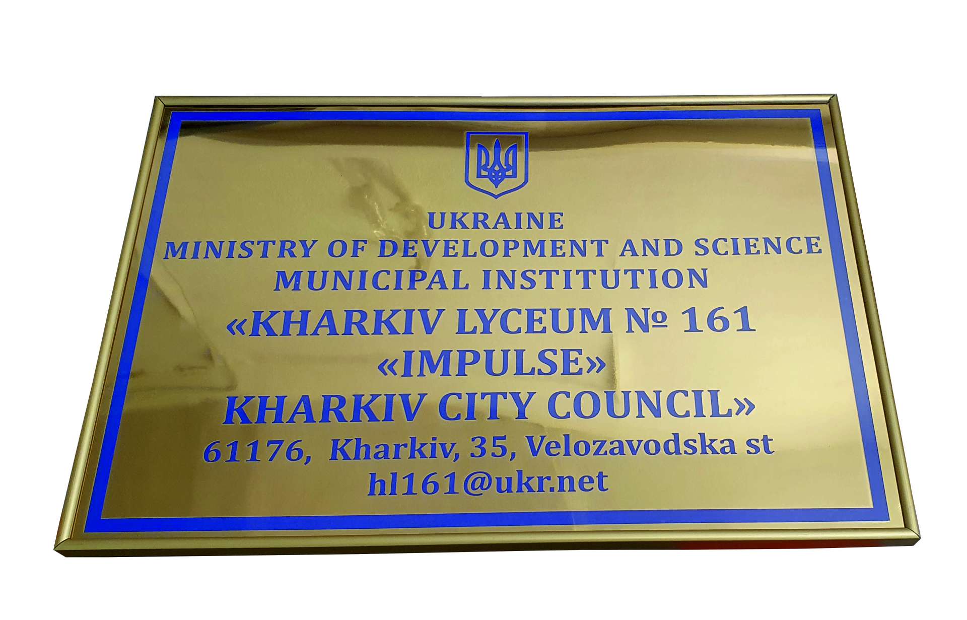 Вывеска из золотого пластика с защитным прозрачным стеклом в защитной золотистой алюминиевой рамке в Одессе. Изготавливаем любой размер вывески с индивидуальным просчетом.