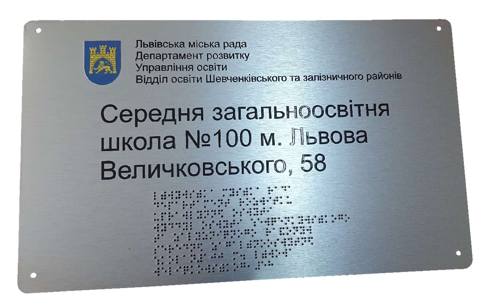 Вывеска из серого композита со шрифтом Брайля. Толщина материала 3мм. Не выгорает, устойчива к погодным условиям. Изготовление любого размера.